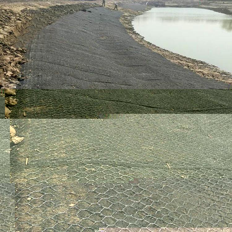 1、加筋三維植物網墊是聚丙烯經過擠成單絲後無規則的疊成一定厚度并且通過熱黏結成土工網墊,具有開敞式的三維空腔結構,孔隙率大于90%,同時通過專門的設備,将各種鍍層(鍍鋅、鍍高爾凡、鍍鋁鋅合金、PVC覆塑)的雙絞合六邊形金屬網複合到柔性墊中。